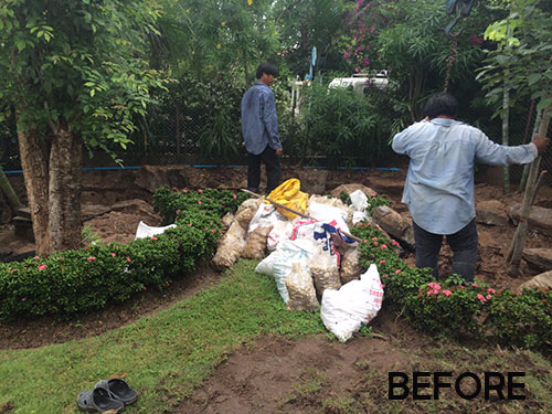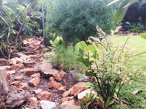 In this example above (Tropical Landscaping for Large Hua Hin Garden) the whole side of this large garden was nothing more than a muddy ditch, with a few haphazardly planted beds. The idea was to create a much more attractive feature, to cover the side and add added interest. A dry stream is perfect for this type of landscaping problem.