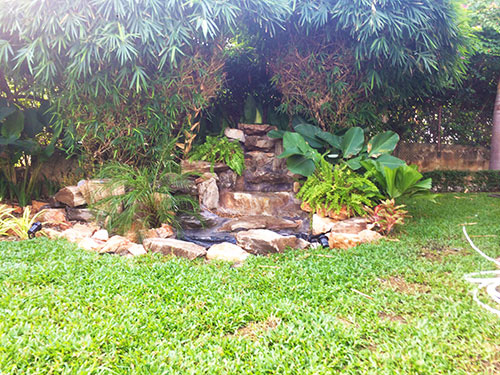 And at the top of the steam, the Thai Garden Design team build this 1.50m tall waterfall feature, which the team adapted to hold a small pond, with pump and switch so the top of the 'dry stream' creates the calming water sound. If you have garden landscape dreams and reside in the Kingdom of Thailand, feel free to contact us for a friendly chat about your needs.
