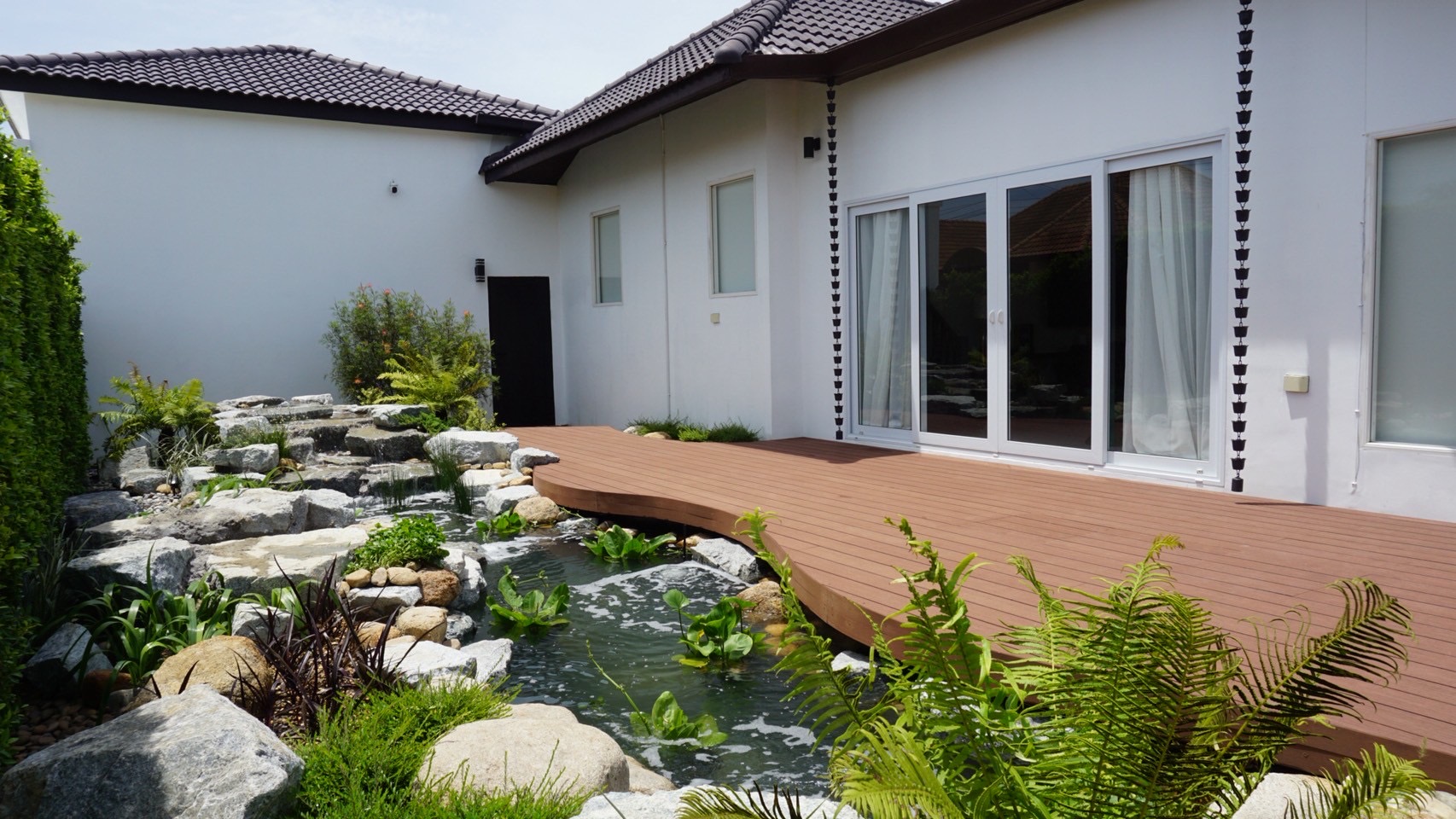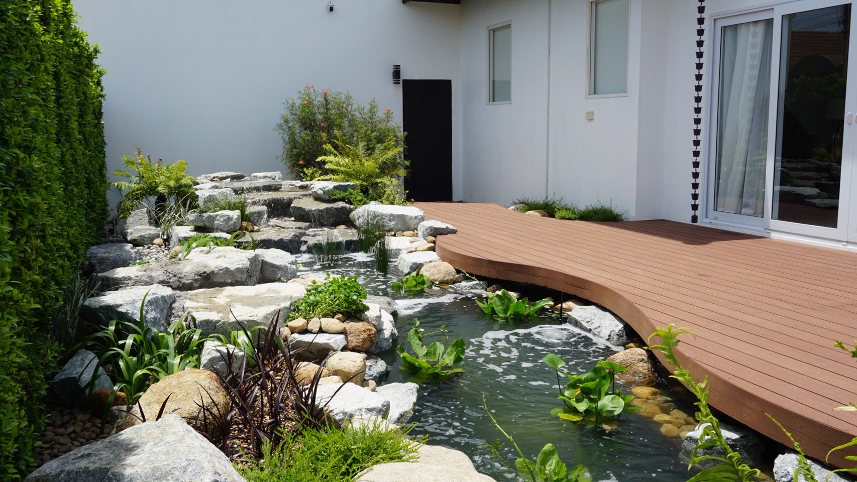 The team recently built this Amazing pond and deck for a customer in Central Pattaya. A pond worthy of Instagram style selfies. The project included the complete design and build of a natural rock entrance pond, complete with viewing deck (just beside the patio doors of the house). The pond is viewable from inside the home, and makes a terrific spot to sit and enjoy the waterfall and fish.