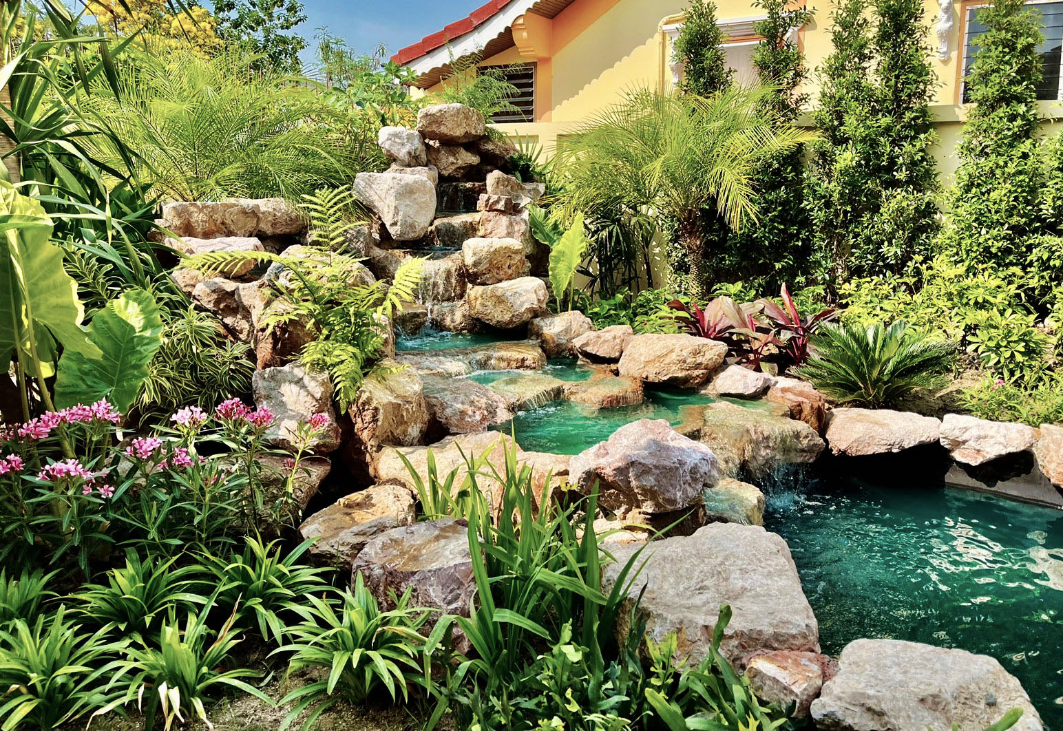 Previous image Next image Tropical Landscape Design This cascading waterfall is exceptional tropical waterfall and pond