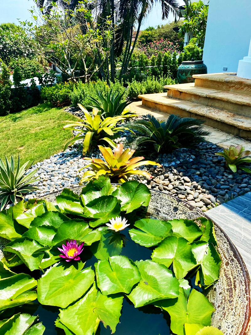 Previous image Next image tropical plant design thailand Lotus plants, agave and sago palms decorate these sandstone steps Tropical garden designer in Hua Hin Thailand