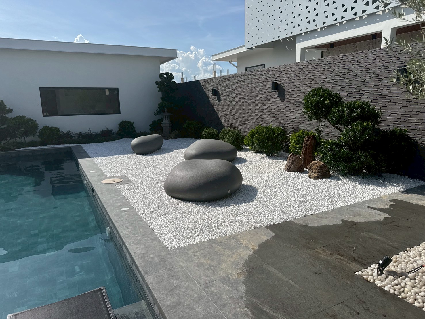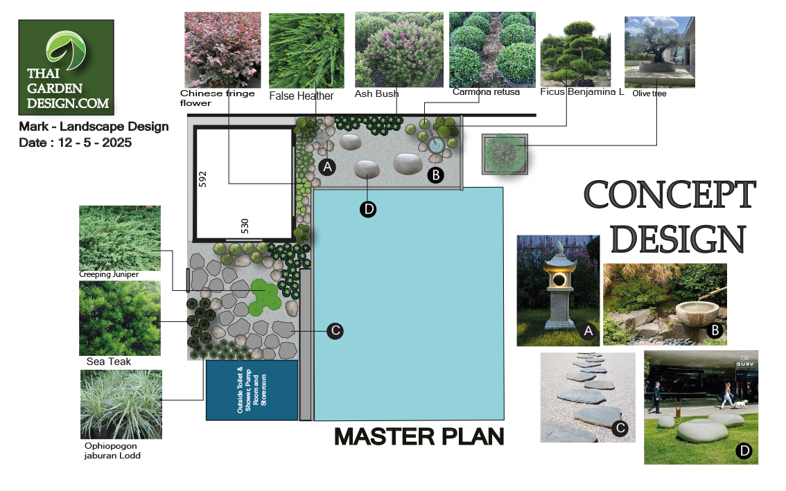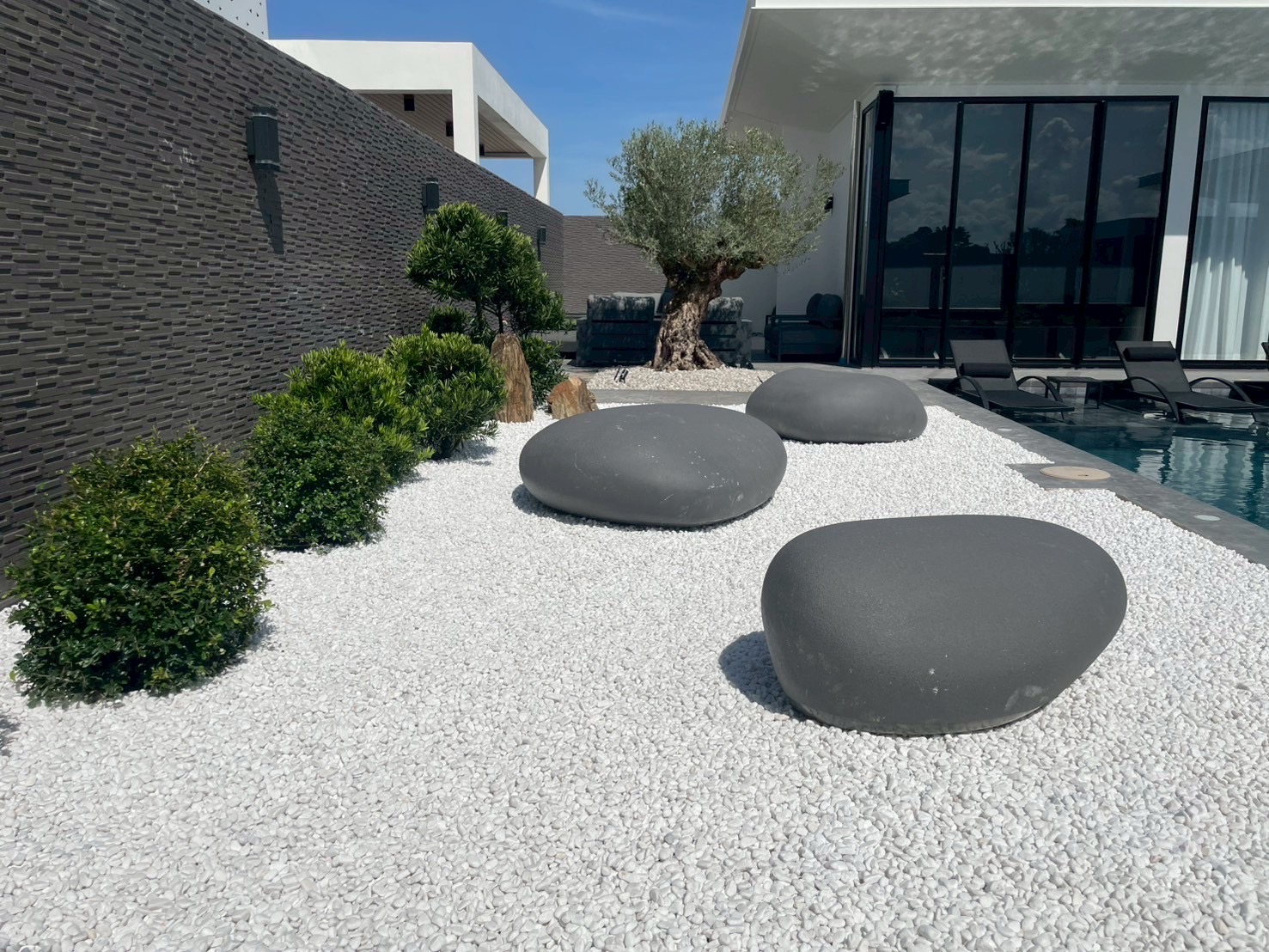 Having clear ideas about the Shape and Layout, it was Thai Garden Designs job to bring this to Life, advising on different tree and plant type (low maintenance) as well as the Different types of Pebbles, Stones and Pavers.