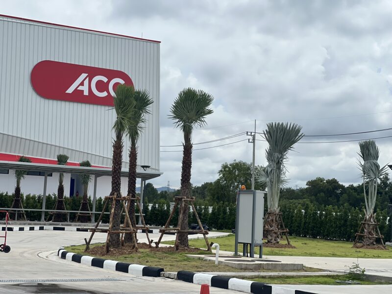 To create the impressive and modern feel, Thai Garden Design included a good number of mature foliage trees and palms, including: Blackboard Trees, Wax Palms, Bismarck Palms, Java Palms, Foxtail Palms, large Indian Oak trees ! and over 2000 Ficus hedges and also some bright red lipstick palms and 200 Australian brush trees, to decorate the areas closer to the entrance and matching nicely with the ACG colour scheme. In total, the agreement included over 200 trees, to be planted in the main garden at the front of the factory, viewable from the road side and giving an impressive landscape befitting of this ACG premises.