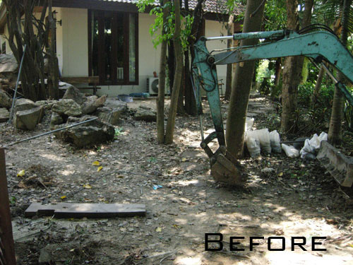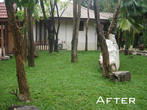 Some seriously needed landscaping work was recently performed at a home in Ayutthaya province, Thailand. The old landscape was basically heavily wooded and the ground was bare and stoney. Much of the treescape had overgrown and needed to be cut away and removed. Although the soil was good quality, it was unattractive and the owners wanted to grow new grass.