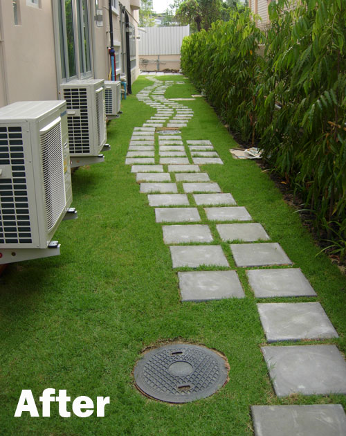 The change is pretty dramatic. The earth has been replaced, and the ground levelled and properly prepared so that new grass is able to grow and thrive. A simple block pathway has been installed along the length of the walkway, with new trees planted along the borders to hide unattractive pipework etc.