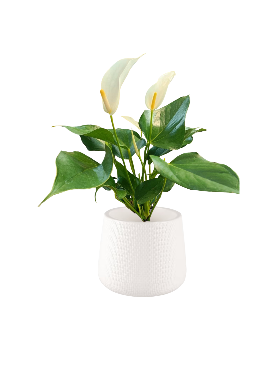 Anthurium White is an elegant indoor plant known for its pure white, heart-shaped blooms and glossy green leaves.
