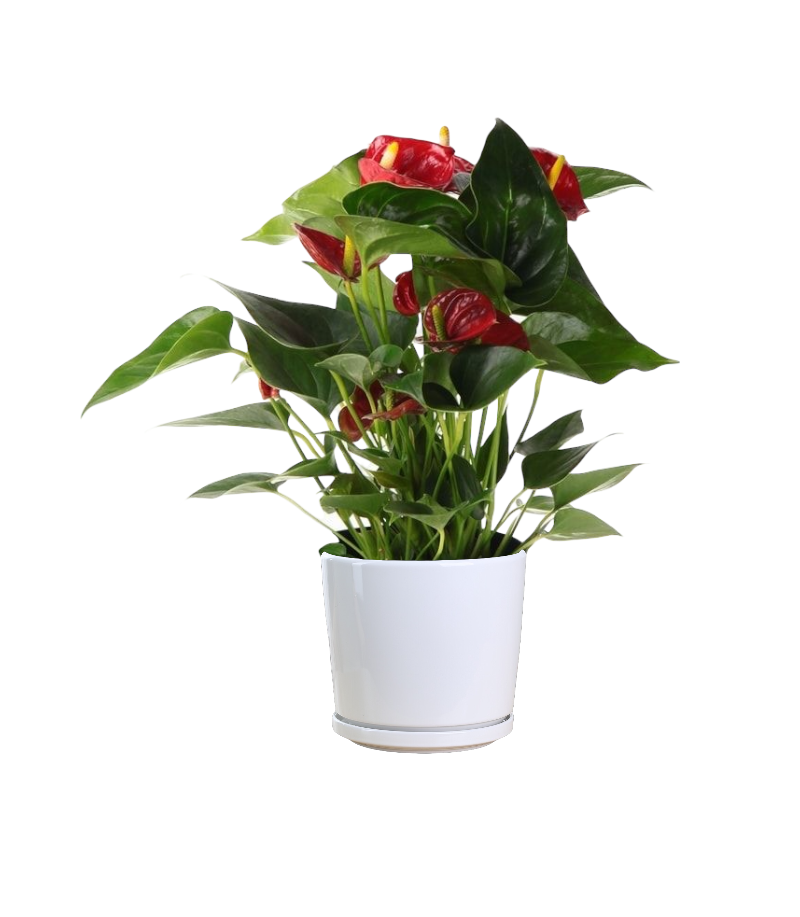 Flamingo Flower (Red) stands out with bold red, heart-shaped blooms and glossy green leaves.